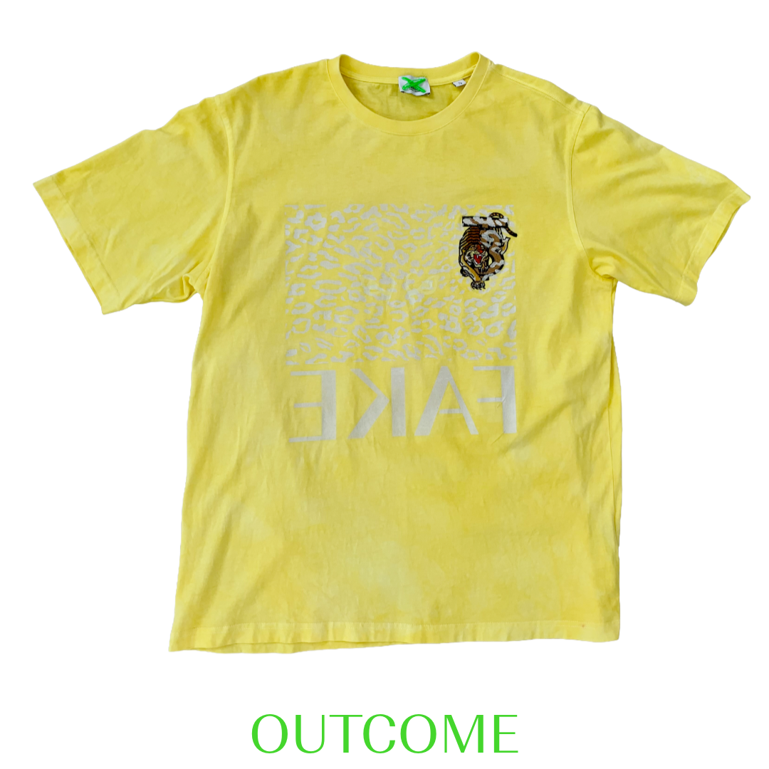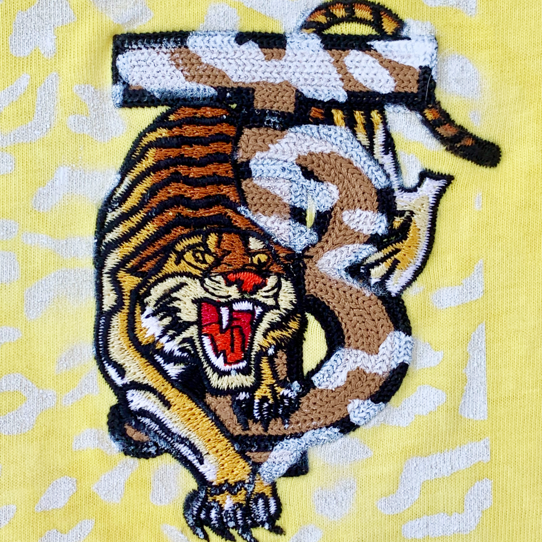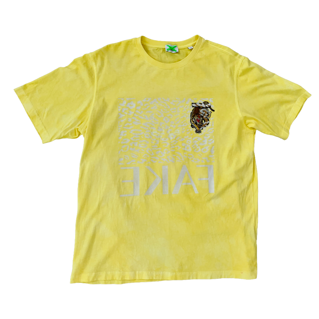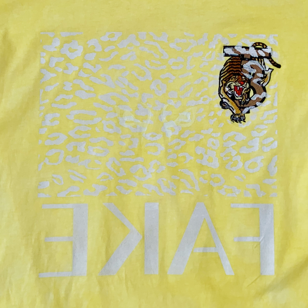 Sun-bleached yellow cotton hosts a ghost-print of leopard spots, overlaid by an inverted white “FAKE.” A prowling tiger embroidery claws the upper corner like graffiti on a billboard. The tee is a midday mirage—heat, hunger, and hype shimmering together until the line between predator and prey is too bright to see.