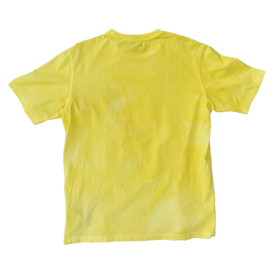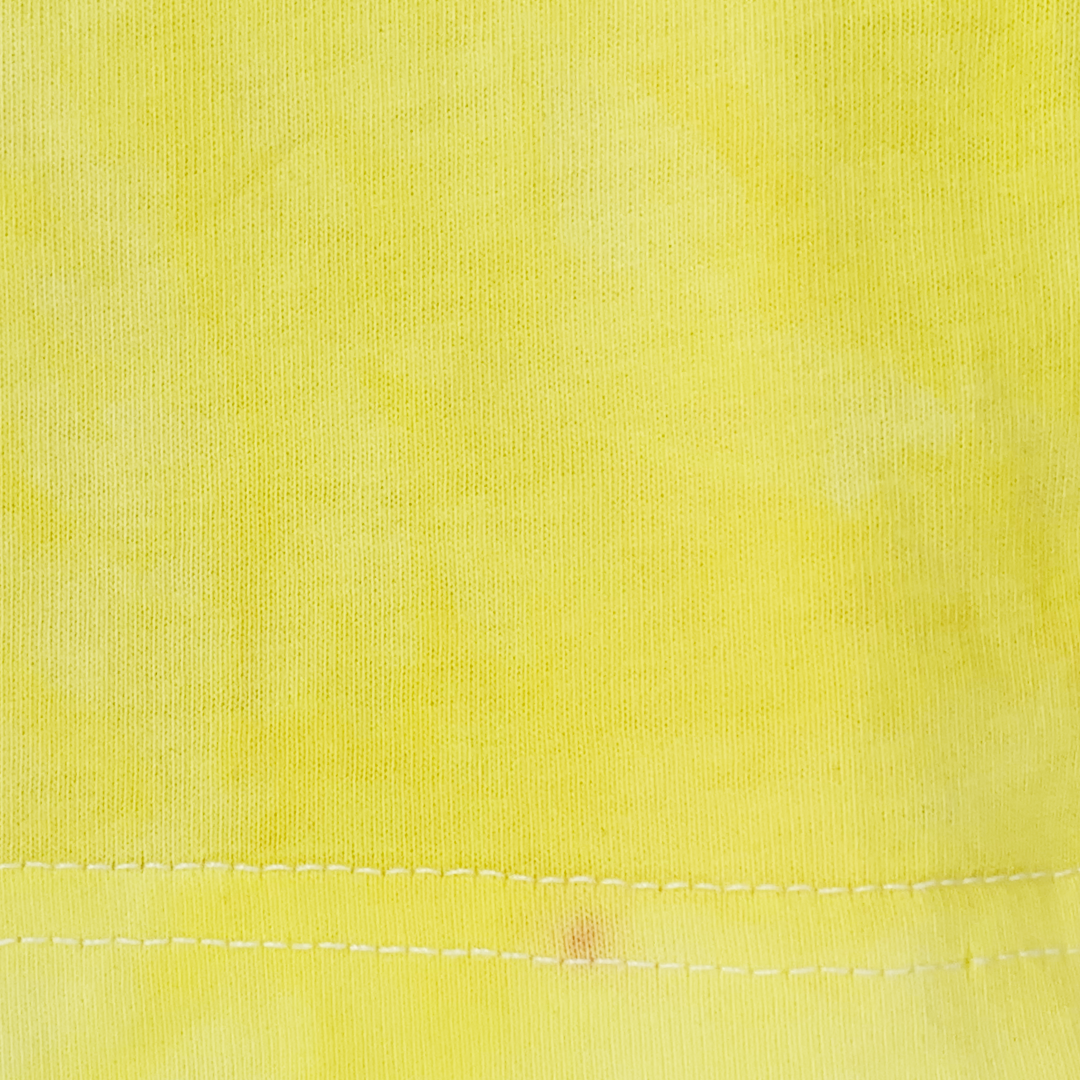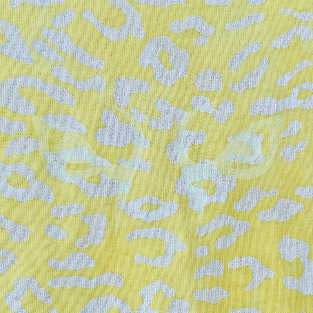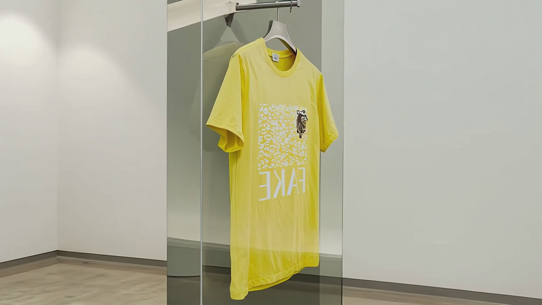 Sun-bleached yellow cotton hosts a ghost-print of leopard spots, overlaid by an inverted white “FAKE.” A prowling tiger embroidery claws the upper corner like graffiti on a billboard. The tee is a midday mirage—heat, hunger, and hype shimmering together until the line between predator and prey is too bright to see.